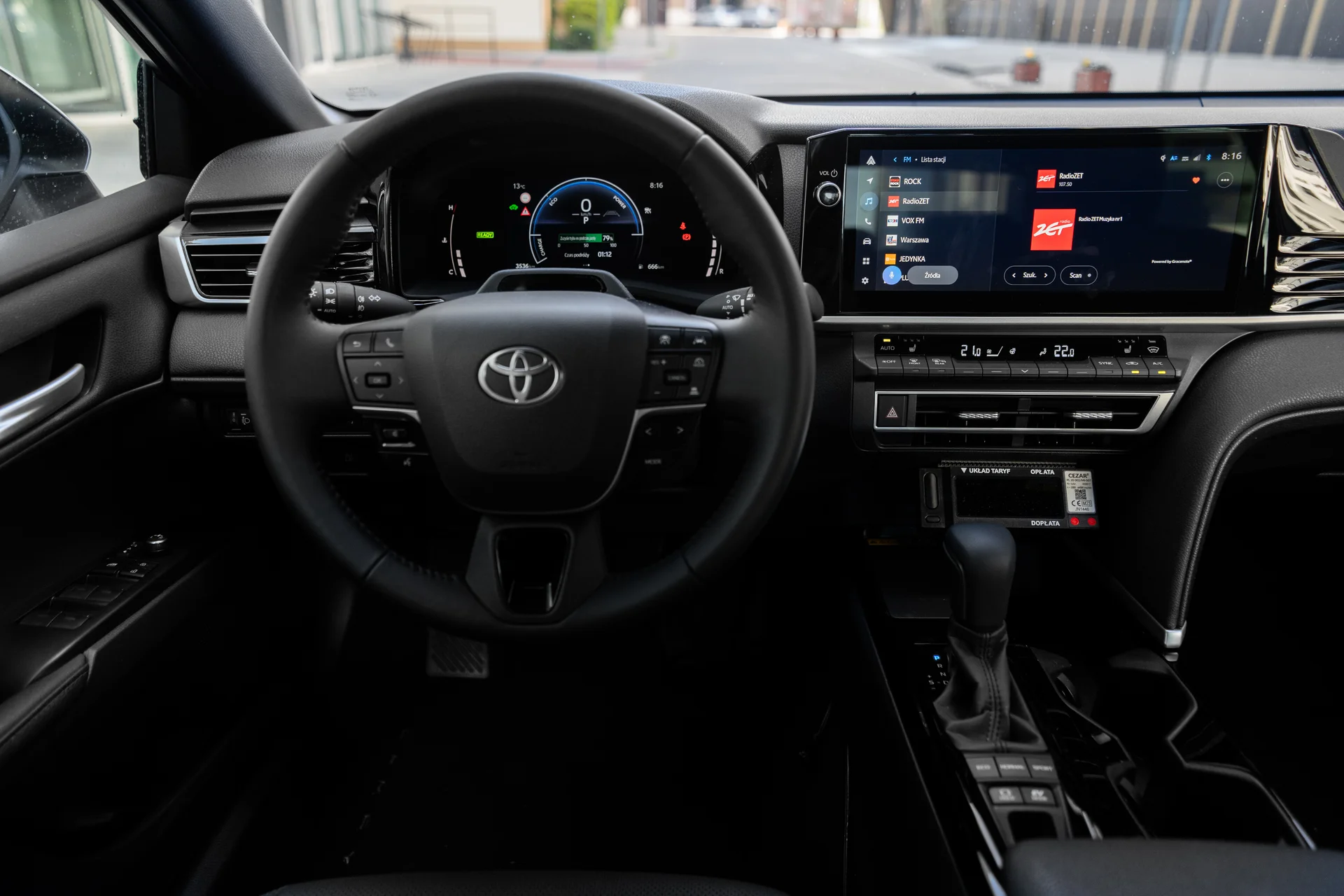 W Camry pod maską znajdziesz 2,5-litrowy silnik o mocy 178 KM oraz 120-konny silnik na prąd. Łącznie masz do dyspozycji 218 KM, które trafiają na przednie koła poprzez skrzynię e-CVT. Ten samochód sprawdzi się w mieście i poza nim.